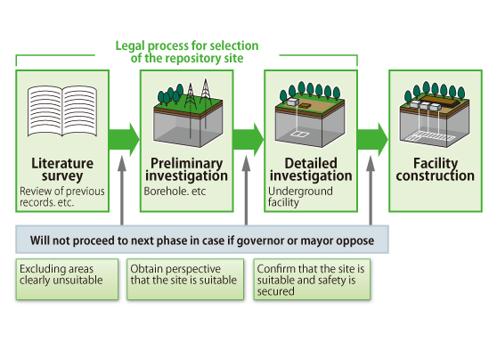 The selection of the geological disposal site will be conducted according to three stages of site investigation. These are the literature review, preliminary investigation, and detailed investigation, as defined by law. The sites deemed suitable for the disposal facility will be narrowed down accordingly. While proceeding with construction of the disposal facility at the selected site, some operations such as loading, placing, and backfilling of high-level radioactive waste will be performed simultaneously.