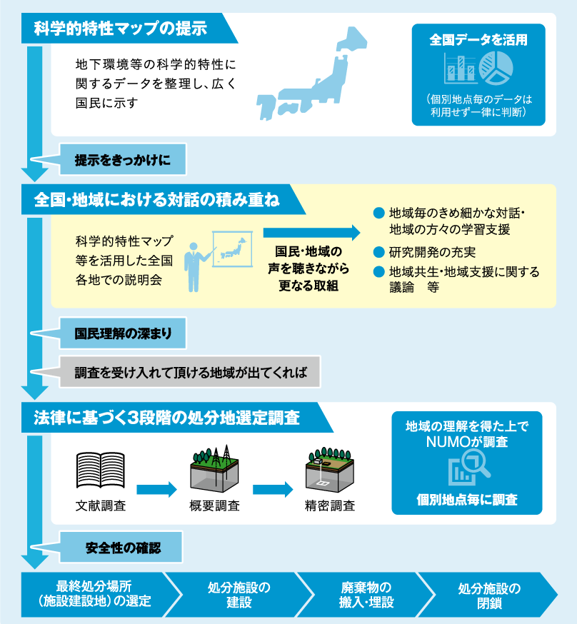 ●科学的特性マップの提示は、処分の実現に至る長い道のりの最初の一歩です。提示をきっかけに、全国各地できめ細かな対話活動を丁寧に進めていきます。